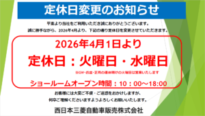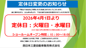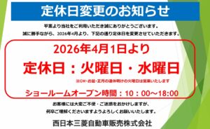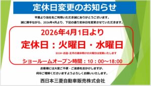 門真店いつも門真店のブログをご覧いただきありがとうございます😌今日は門真店よりお客様へ とっても大切なご案内です❗ 西日本三菱自動車販売株式会社は2026年4月より定休日を変更させていただくことに…