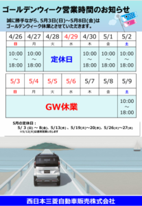 宇和島店こんにちは!宇和島店の清家です🎏 5月1日より三菱・初夏のフルスロットル祭りが始まります🔥 期間は5月1日(金)~5月31日(日) 期間中サービスでは、タイヤ、エアコンフ…