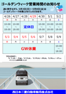 松原店こんにちは松原店ですゴールデンウィーク休業のお知らせです■緊急時の対応について休業期間中のお車のトラブルや緊急サービスにつきましては、「あんしんサポートディスク」または「JAFロードサービス」をご利用…