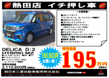 4月24日から引き続きゴールデンセール開催中です! その中から熱田店イチオシ車のご紹介です。 「デリカD:2 HYBRID MZ 全方位カメラパッケージ」 👆室内ひろびろ 荷室を100ミリ拡大。 大き…