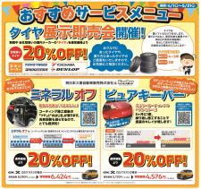 4月24日(土)から「ゴールデンセール」を開催します。 その中から「おすすめサービスメニュー」のご紹介です。 当社取扱い国内メーカーの「タイヤ」を 通常価格の20%OFF! ボディメンテナンスの「ミネ…