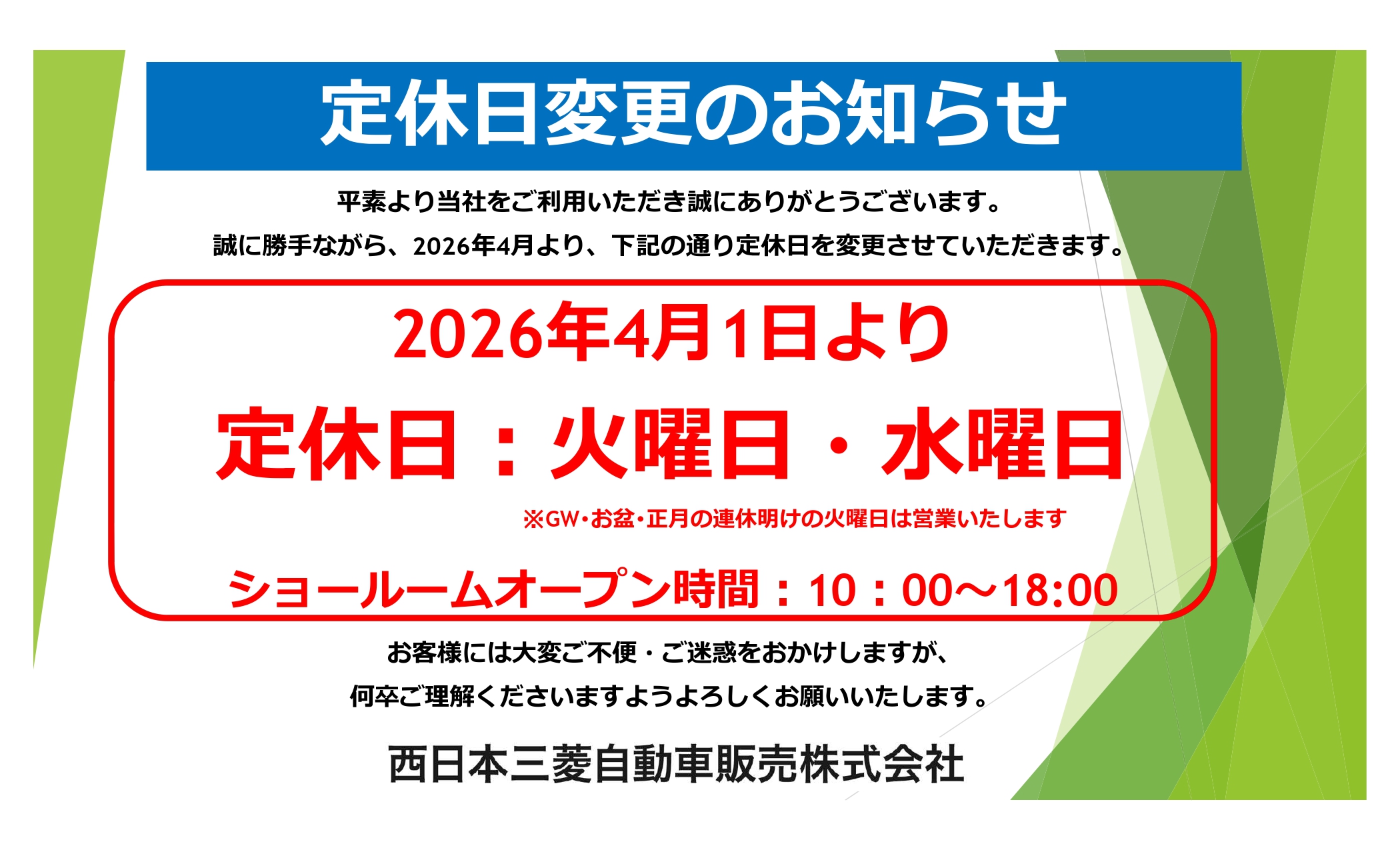 4月から定休日が変更になります。