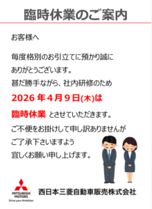 浜田店毎度格別のお引き立てに預かり 誠にありがとうございます。 甚だかってながら 社内研修のため 2026年4月9日(木) は 臨時休業とさせていただ…