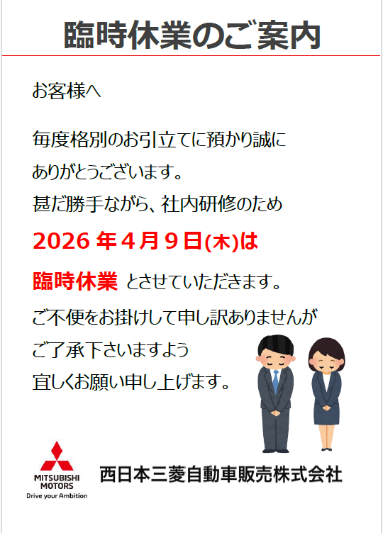 浜田店毎度格別のお引き立てに預かり 誠にありがとうございます。 甚だかってながら 社内研修のため 2026年4月9日(木) は 臨時休業とさせていただ…