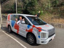 こんにちは。 浜田店ショップスタッフの向井です。 浜田市では滅多に見られない車が浜田店へ来ました~~ ド派手なデリカD:5!! 2025年 大阪・関西万博バージョンですよ。 まずは池部営業統括本部長と…