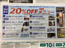 こんにちは! 暑い日が多くなり、車に乗った時の暑さが夏を感じますね。 6月からのサービスのお得なメニューのご紹介をします。 季節の商品が20%オフでお得に出来ますよ~! 雨の日が多くなる…
