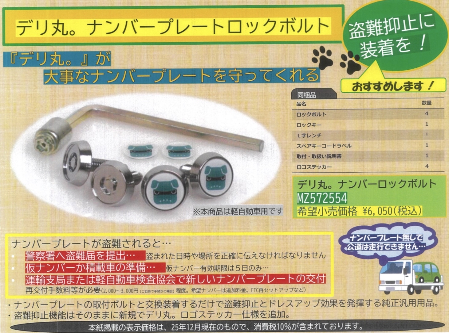 今回は、ナンバープレートの盗難防止ロックボルトのご案内です。