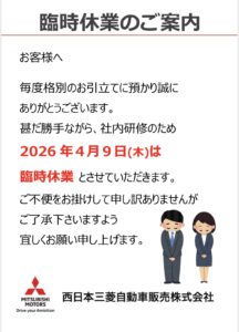 東成店新年あけましておめでとうございます。 今年も西日本三菱自動車販売(株)東成店をどうぞよろしくお願いいたします。 東成店では、本日から2月1日までの間、『西日本三菱 新春初売りフェア!』を開催しておりま…