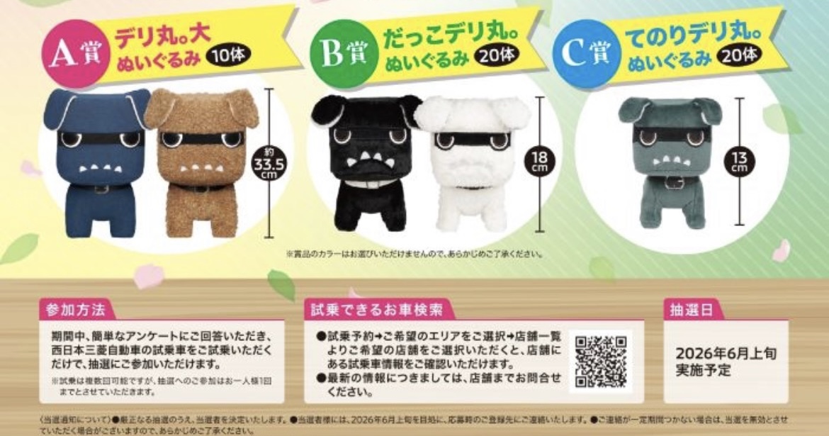 このキャンペーンでは、期間中にご試乗いただいたお客様に抽選で「デリ丸。ぬいぐるみ」が合計50名様に当たります!