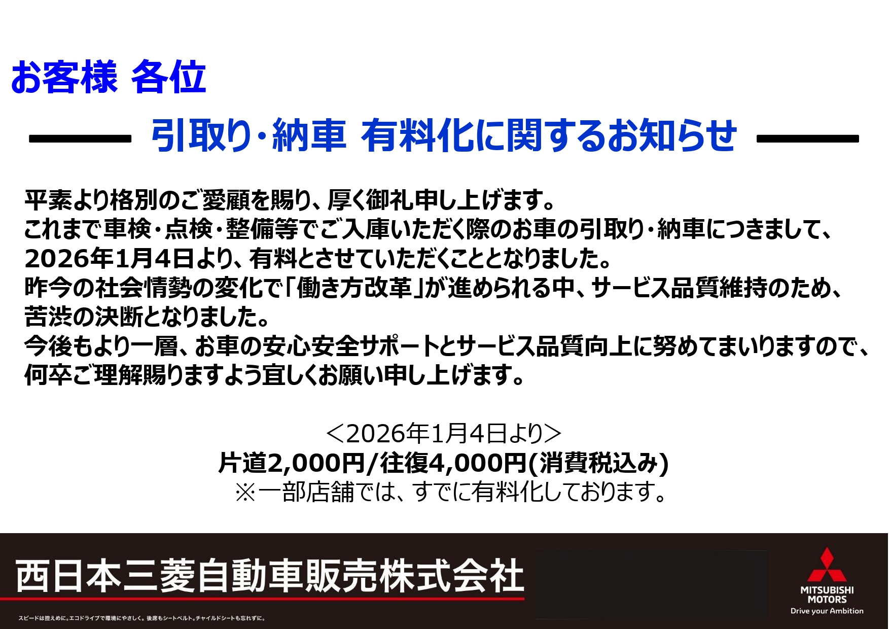 また、1月より点検時の洗車有料化、引取・納車の有料化をさせていただきますのでご理解賜りますようお願い申し上げます。