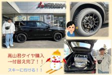 こんにちは よく晴れた日曜日 本陣店スタッフ一同 おかげさまで元気に過ごしております 今日は 三菱自動車工業㈱研修生の 高山君が 愛車、アウトランダーPHEVの スタッドレスタイヤ購入→付替…