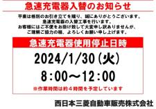 日頃より西日本三菱自動車販売をご愛顧頂き、誠に有難うございます。 下記期間 当店の急速充電器のご利用ができません。 ご不便をおかけしますが、悪しからずご了承くださいますよう宜しくお願い致します。 &n…