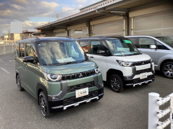 今、笠岡店には中古車で色違いのデリカミニを並べて展示しています!