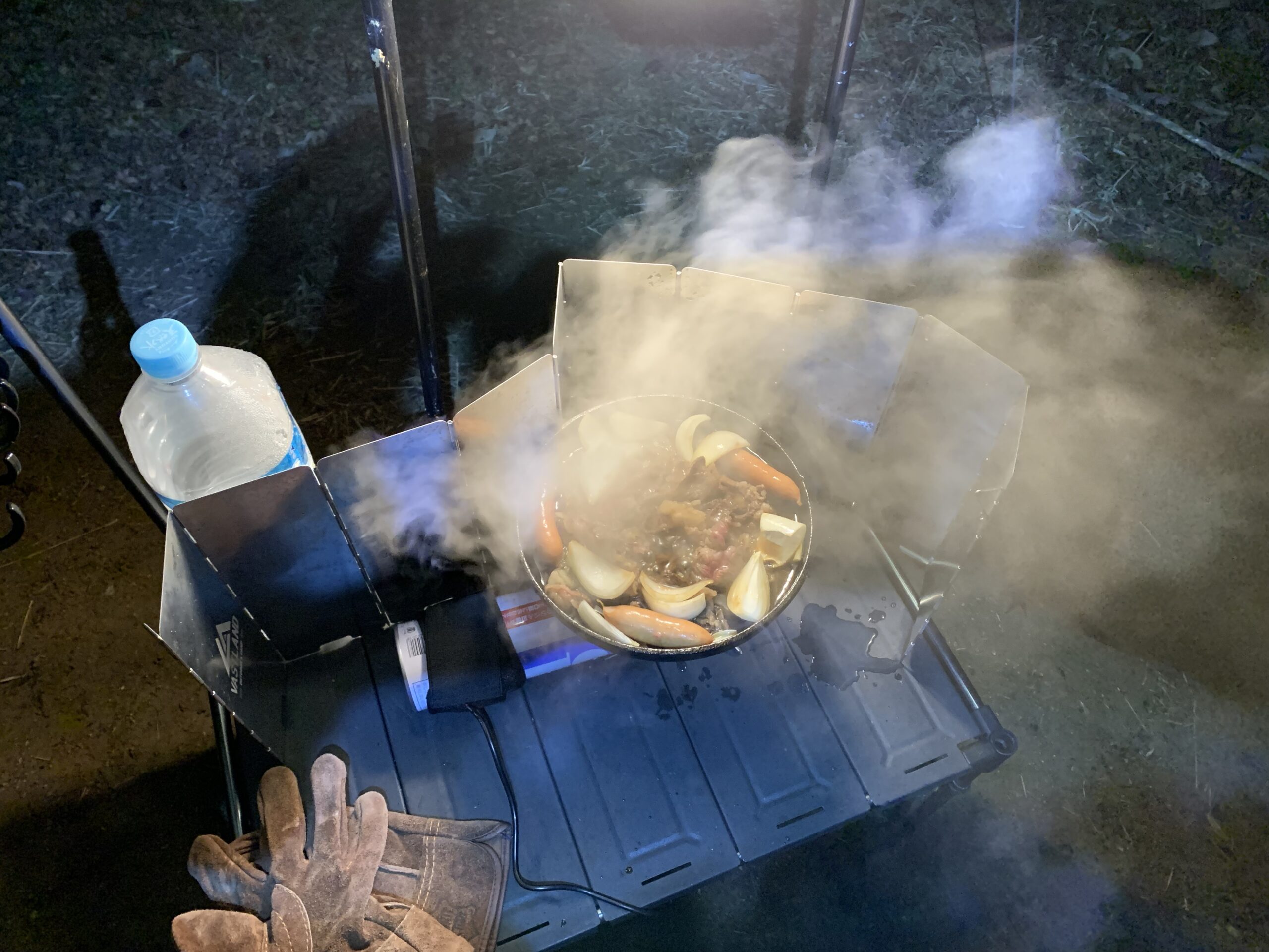 この後、焚火を楽しんで、湯たんぽをストーブで温めて就寝(–Zzz