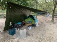 笠岡店 内田です。 先日心身を癒しに山へぼっちキャンプをしてきました(^^; 今回5mのシートを使ってタープにしてみました。 ポールを2本忘れたので木と車にロープで引っ張って屋根を作り、その下にテント…
