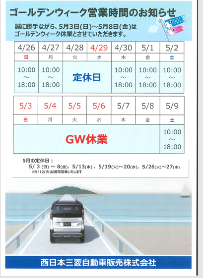 岸和田店みなさんこんにちは! 営業の高野です もうすぐ待ちに待ったゴールデンウイークですね 😁 どこかへお出かけされますか? お車を利用される際は安全運転でお願いいたしますね さて当店も誠に勝手ながらお休み…