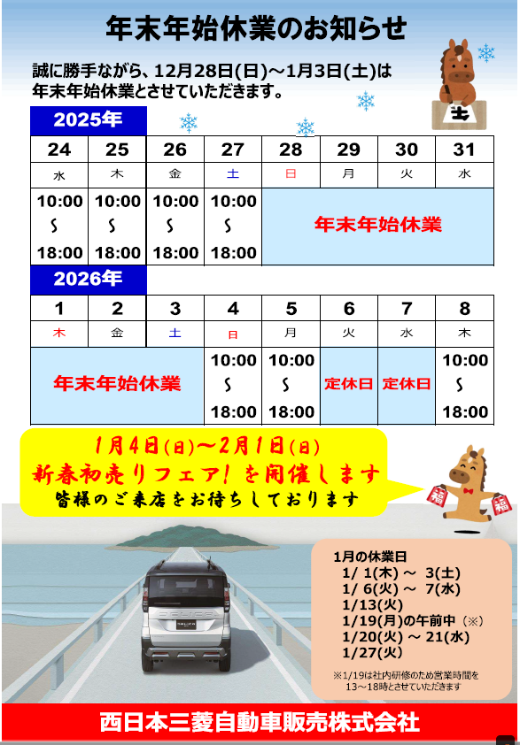 尚、当社は 12/28(日) ~ 1/3(土)まで期間、年末年始休暇とさせて頂きます。