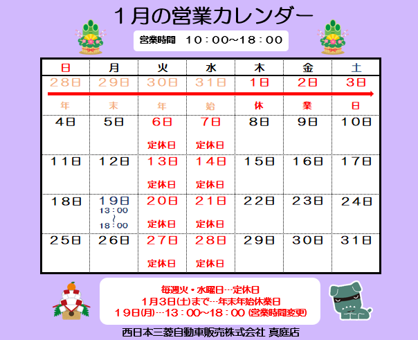 真庭店いつも真庭店のブログを見てくださり、 誠にありがとうございます。 1月の営業日についてお知らせです🚙 誠に勝手ながら、1月19日(月)は 社内研修のため営業時…