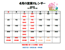 いつも真庭店のブログを見てくださり、 誠にありがとうございます♪ 4月の営業日について お知らせです 4月から定休日が変更になります。 <変更前> 毎週火曜日、第3水曜日 ⇩ …