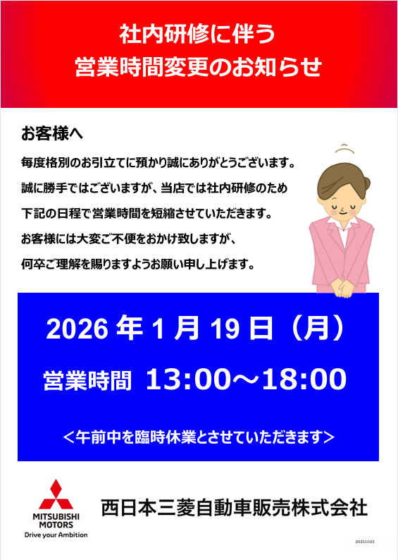 松江店こんにちは!松江店です(o^―^o) 2026年1月19日(月)の営業時間のお知らせです。 社内研修のため、営業時間を短縮させていただきます(*_ _) 開店時間は13:00になります …