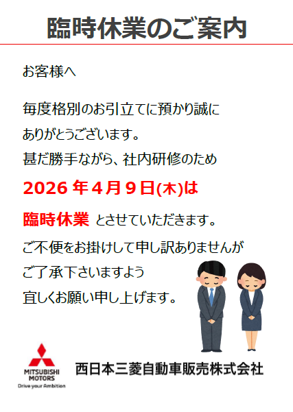 4月9日(木)は臨時休業とさせていただきます。