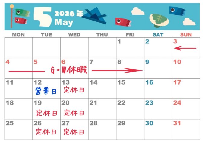 会社HPに掲載されている休日カレンダーに基づき、当店のGW休業日は以下の通りです