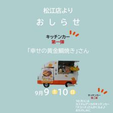 9/10(土)9/11(日)松江店では キッチンカー[幸せの黄金鯛焼き]さんとコラボ開催中 暑い中ご苦労様です おいしい鯛焼きを店頭販売していただいております。 鯛焼き種類も6種類ありどれもおいしそう…