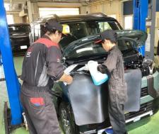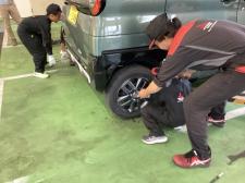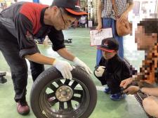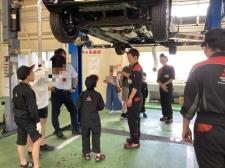 前回の続きです☆ ホイールナットを締め付けます。 ウォッシャー液補充中。 下廻りを見学しています☆ 車の裏は普段見る機会がない為キッズ整備士の皆さんや保護者の方も興味津々の様子でした 最後に「キッズ整…
