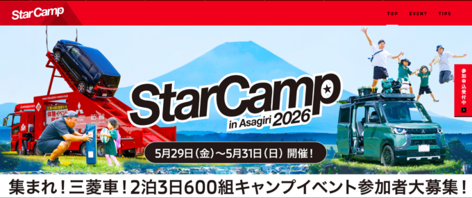 守口店三菱自動車工業株式会社は、 オートキャンプイベント「スターキャンプ2026 in 朝霧高原」を 5月29日(金)~31日(日)に、 朝霧高原「ふもとっぱら」(静岡県富士宮市)にて開催することを決定し、…