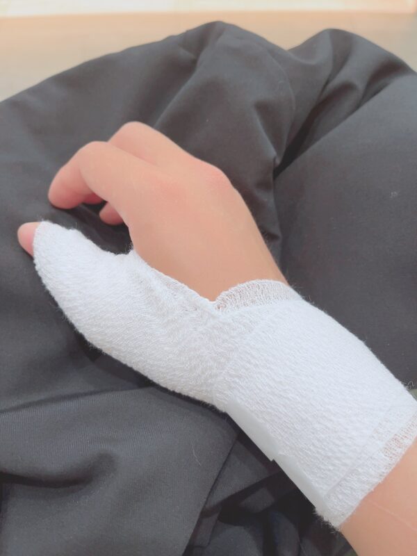 クラブの勢いが止まらず、スイングのフィニッシュを右手親指がすべて受け止めて