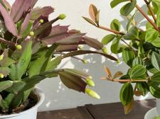 こんにちは♬ 風はありますが、日差しが気持ちいいですね 3年目のシャコバサボテン、今年もつぼみをつけてくれたのですが…。 写真でもわかるように、葉っぱの一部が赤くなっています。 今年は植…