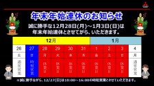 こんにちは(^^♪ 今年も残すところ一週間余りになりましたね。 当社は、12月28日~1月3日までお休みをいただきます。 ご不便をおかけしますが、ご理解の程よろしくお願いいたします。 お車の修理等で緊…