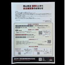 日頃は岡山東店をご愛顧いただき、誠にありがたく、心より御礼申し上げます。 さてこの度、店舗耐震化の為岡山東店は建て替えする運びとなりました。 大変ご不便おかけしますが、何卒ご了承いただけますようお願い…