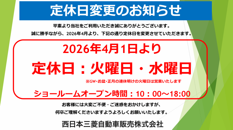 4月より定休日が変更となりますので