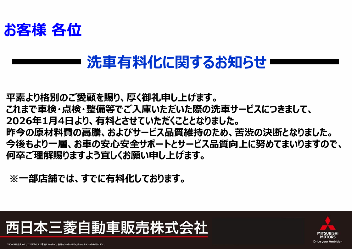 島田橋店これまで点検・車検・整備等でご入庫いただいた際の 洗車サービスにつきまして、 2026年1月4日(土)より、 有料とさせていただくことになりました。 昨今の原材料費の高騰、サービス品櫃維…