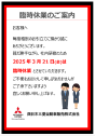 臨時休業のご案内 甚だ勝手ながら、 2025年3月21日(金)は 社内研修の為、 臨時休業とさせていただきます。 ご不便をお掛けし…