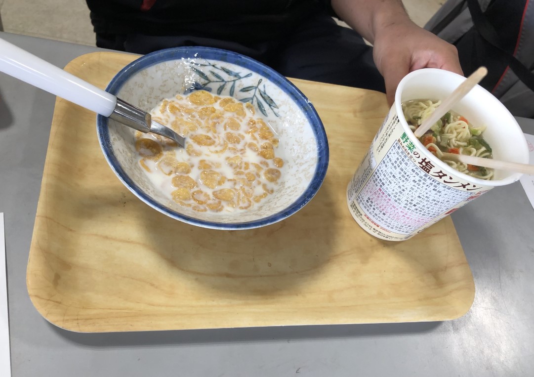 「今日の昼はコーンフレークとラーメンのコラボです!!」