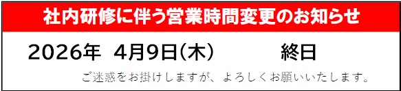 4月9日(木)は社内研修の為、終日休業とさせていただきます。