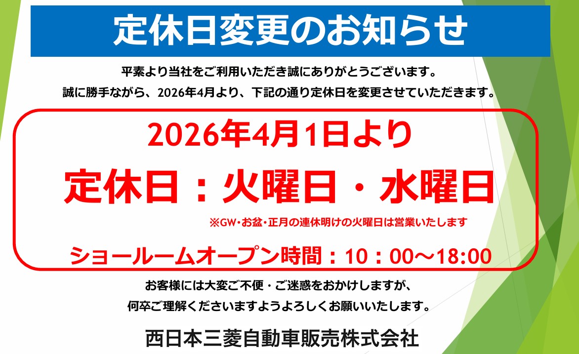 高山店いつもありがとうございます。 西日本三菱自動車販売 高山店です! 4月からの営業日についてご案内です。 2026年3月まで、 定休日は火曜日と第1・3・5水曜日でしたが 2026年4月か…