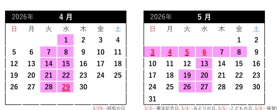 4月・5月の営業スケジュールは以下の通りです。