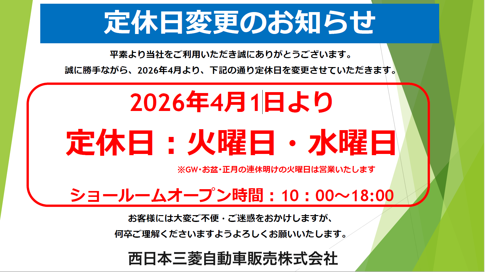 定休日変更のお知らせ。