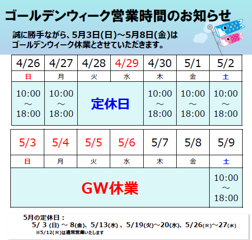 勝手ながらゴールデンウィーク休業とさせていただきます。