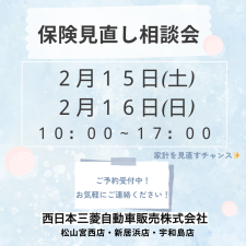 宇和島店よりお知らせです♧ 2月15日(土)、2月16日(日)の2日間 西日本三菱自動車販売・宇和島店にて 『保険の見直し相談会』を開催します! 家計を見直すチャンス!! 現在ご予約受付中です! お気…