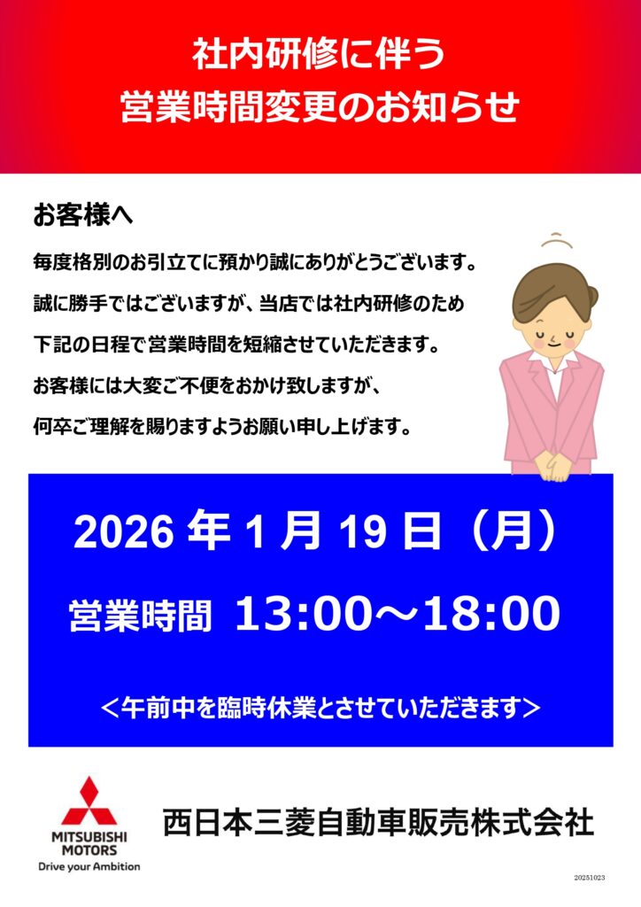 【店舗情報】2026年1月19日(月)営業時間変更のお知らせ お知らせ 2025.12.19 お客様各位 平素より格別のお引き立てを賜り、誠にありがとうございます。 誠に勝手ながら、2026年1月19日(月)は社内研修のため、 開店時間を13:00に変更させていただきます。 尚、閉店時間は通常通り18:00となります。 お客様にはご不便をお掛け致しますが、 何卒ご理解とご協力を賜りますようお願い申し上げます。 前のお知らせ 一覧に戻る
