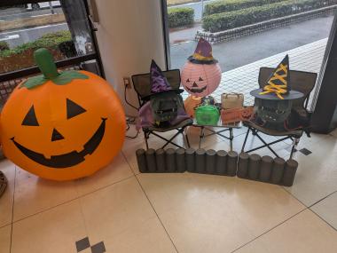 大きなカボチャとデリ丸がお出迎えしてくれています