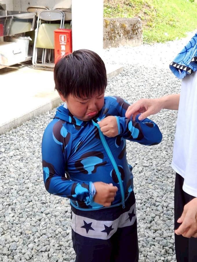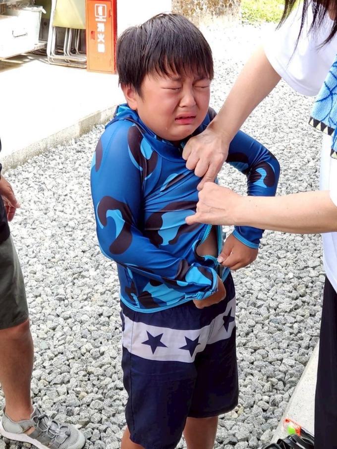 ラッシュガードのチャックがお腹に挟まり泣いております