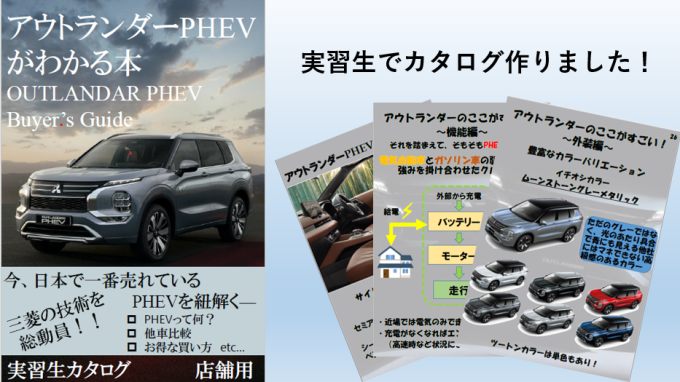 我々実習生が1か月前から作成していたオリジナルのアウトランダ―PHEV紹介カタログ、
