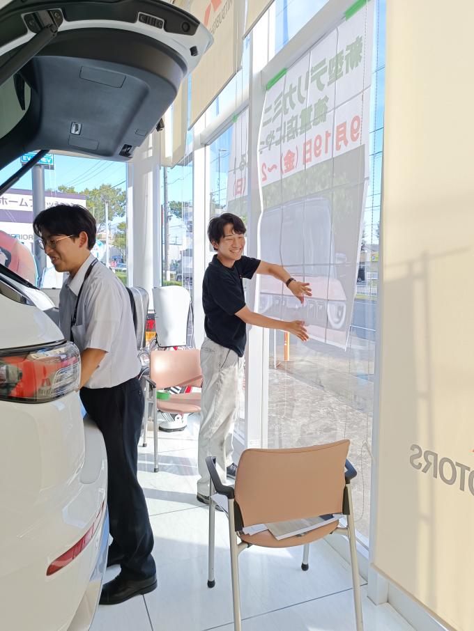僕たち実習生は、徳重店の窓にバカでかいポスターを張りました!