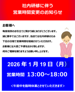 こんにちは! 宇和島店の清家です⛄ いつもブログをご覧いただきありがとうございます! 本日はお知らせです📢 誠に勝手ではございますが、 社内研修に伴い下記の日程で営業時間を短縮させていただきます。 2…